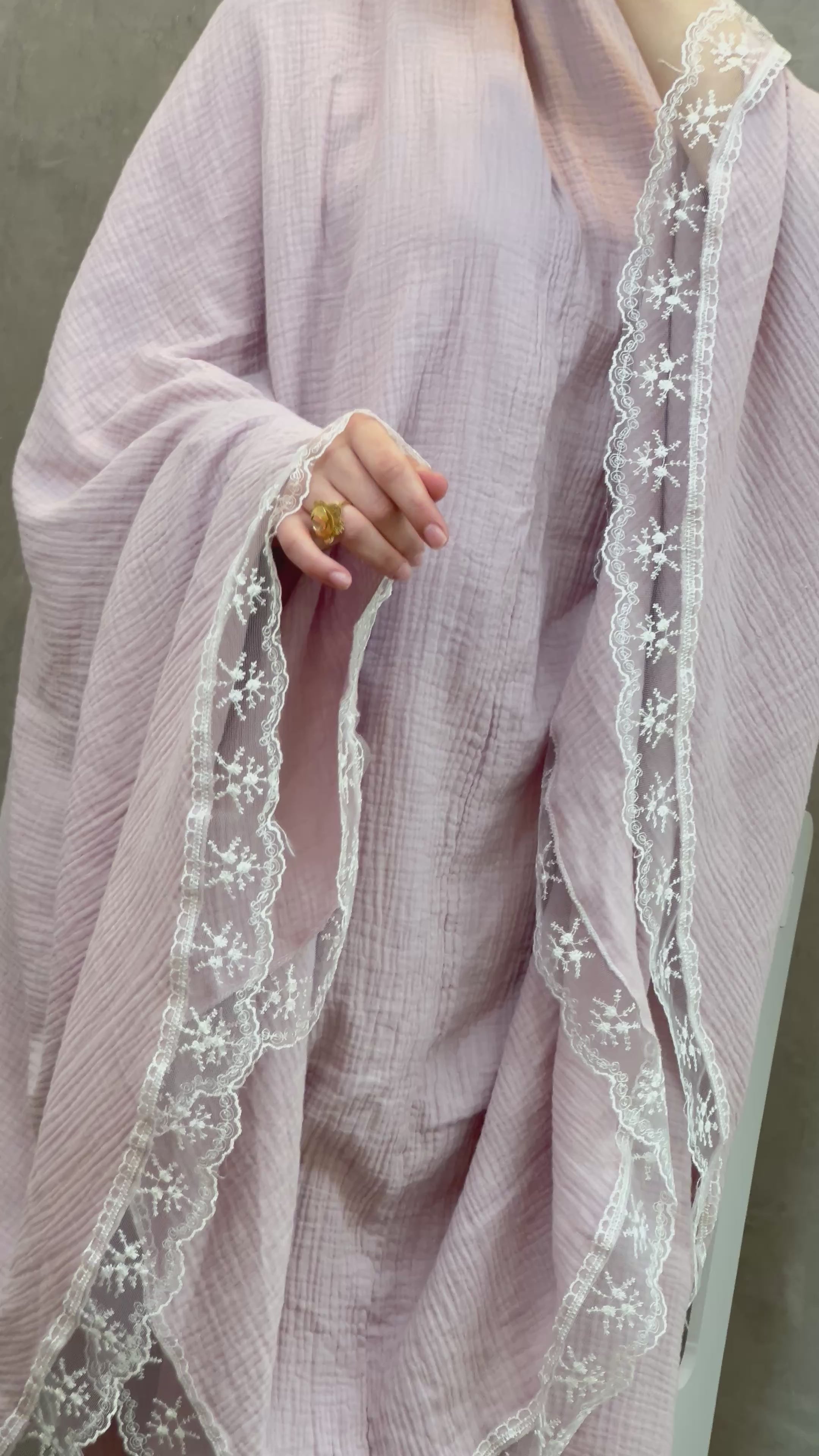 مصنوع من قماش القطن الغازي (Coton Gazi) المعروف بخفّته ونعومته العالية، ما يجعله مثاليًا للاستعمال اليومي والصلاة لفترات طويلة بدون إحساس بالحرارة أو الثقل.