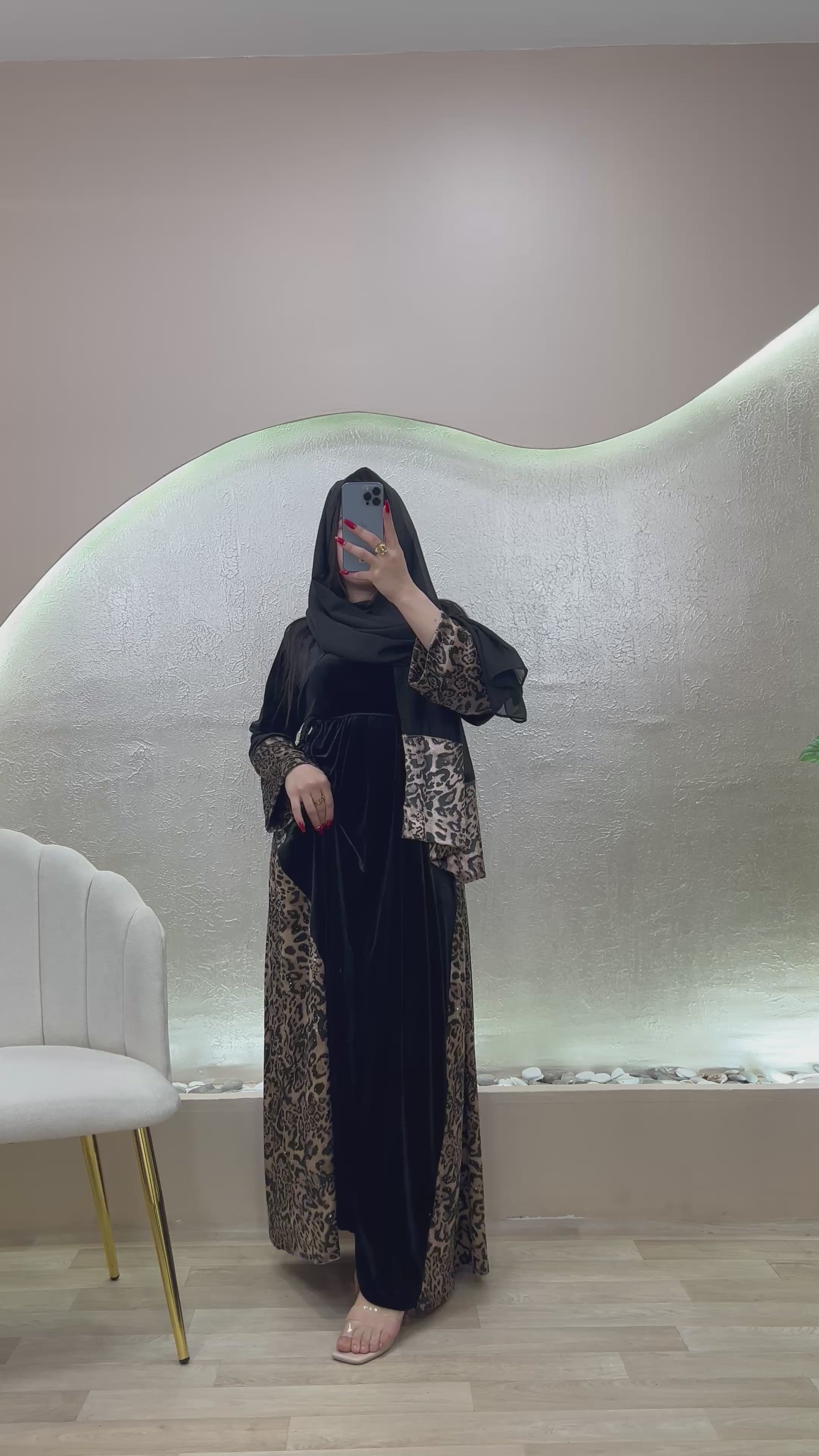تألّقي بإطلالة جريئة وراقية مع Abaya Chahed من NARZIA، عباية فاخرة مصنوعة من Qatifa Royal المخملية، تجمع بين اللون الأسود الكلاسيكي ولمسة نقشة فهد أنيقة تضيف طابعًا عصريًا مميّزًا.